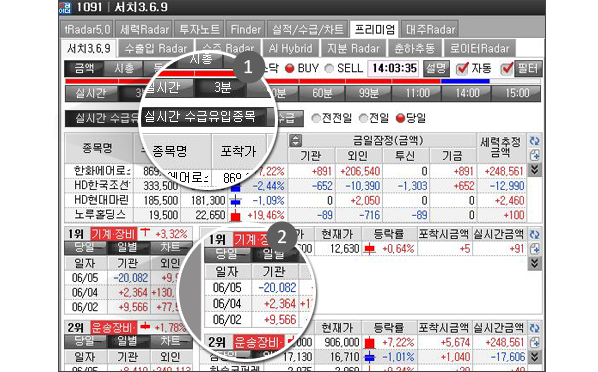 금액/시총/동시 버튼을 활용해 보세요! - ②서치3.6.9는 매매가 집중되는 장초반에는 더 꼼꼼하게 분석하여 줍니다.