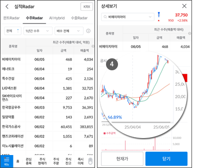 티레이더M (MTS) → 국내주식 → 국내tRadar → 티레이더5.0 → 실적/수급/차트 → 실적