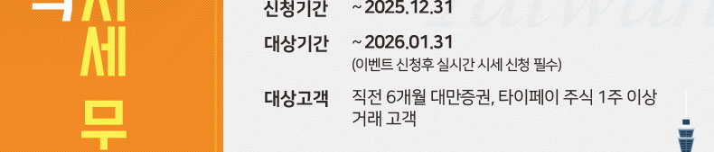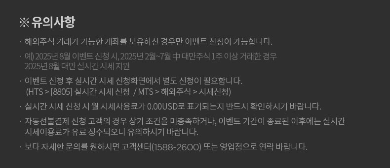 • 예) 2025년 8월 이벤트 신청 시, 2025년 2월~7월 中 대만주식 1주 이상 거래한 경우 2025년 8월 대만 실시간 시세 지원