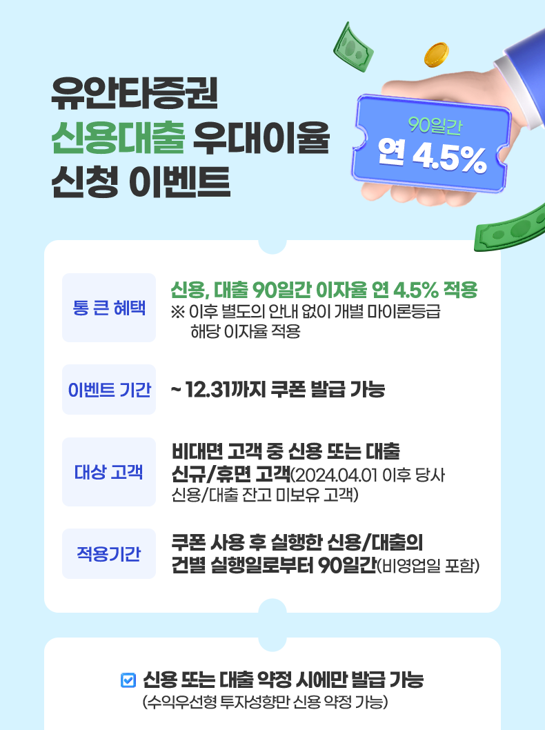 - 대상 고객 : 비대면 고객 중 신용 또는 대출 신규/휴면 고객(2024.04.01 이후 당사 신용/대출 잔고 미보유 고객)