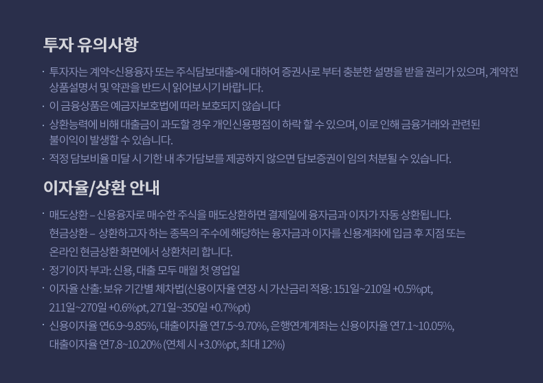 - 투자자는 계약<신용융자 또는 주식담보대출>에 대하여 증권사로 부터 충분한 설명을 받을 권리가 있으며, 계약 전 상품설명서 및 약관을 반드시 읽어보시기 바랍니다.