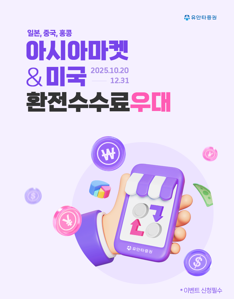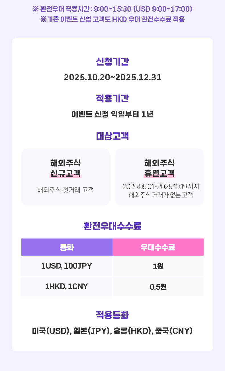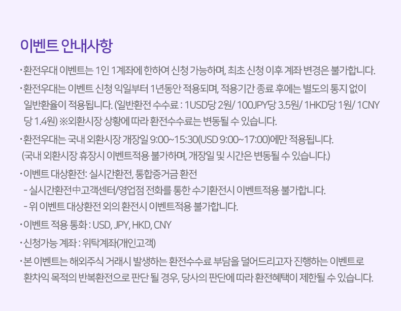 • 본 이벤트는 해외주식 거래시 발생하는 환전수수료 부담을 덜어드리고자 진행하는 이벤트로 환차익 목적의 반복환전으로 판단 될 경우, 당사의 판단에 따라 환전혜택이 제한될 수 있습니다.