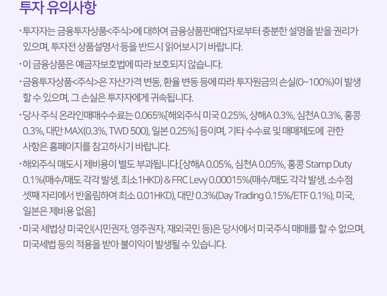 • 해외주식 매도시 제비용이 별도 부과됩니다.[상해A 0.05%, 심천A 0.05%, 홍콩 Stamp Duty 0.1% (매수/매도 각각 발생, 최소1HKD) & FRC Levy0.00015% (매수/매도 각각 발생, 소수점 셋째자리에서 반올림하여 최소 0.01HKD), 대만 0.3%(Day Trading 0.15%/ETF 0.1%), 미국, 일본은 제비용 없음]