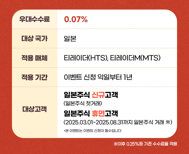 - 일본주식 신규고객 (일본주식 첫거래 고객), 일본주식 휴면고객(2025.03.01~2025.08.31까지 일본주식 거래 無) *본 이벤트는 이벤트 신청이 필수입니다