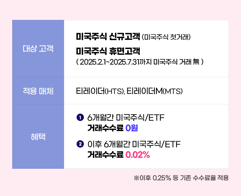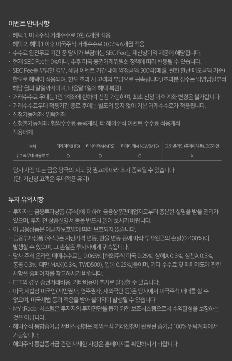 • 적용매체 : 수수료우대 적용 매체 - 티레이더(HTS), 티레이더M(MTS), 티레이더M NEW(MTS) / 수수료우대 미적용 매체 - 그 외 온라인(홈페이지 등), 오프라인