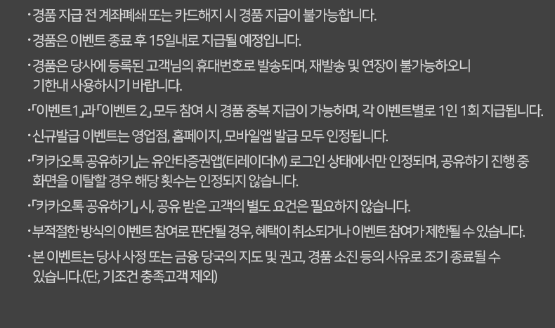 - 본 이벤트는 당사 사정 또는 금융 당국의 지도 및 권고, 경품 소진 등의 사유로 조기 종료될 수 있습니다.(단, 기조건 충족고객 제외)