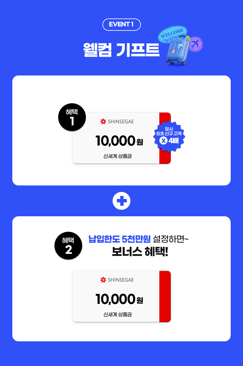 • 혜택1. SHINSEGAE 10,000원 신세계 상품권. 당사 최초 신규 고객 ×4배