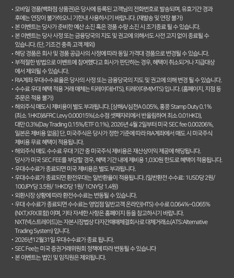 • 해외주식 매도시 제비용이 별도 부과됩니다. [상해A/심천A 0.05%, 홍콩 Stamp Duty 0.1%(최소 1HKD)&FRC Levy 0.00015%(소수점 셋째자리에서 반올림하여 최소 0.01HKD), 대만 0.3%(Day Trading 0.15%/ETF 0.1%), 2026년 4월 2일부터 미국 SEC fee 0.00206%, 일본은 제비용 없음] 단, 미국주식은 당사가 정한 기준에 따라 RIA계좌에서 매도 시 미국주식 제비용 무료 혜택이 적용됩니다.
