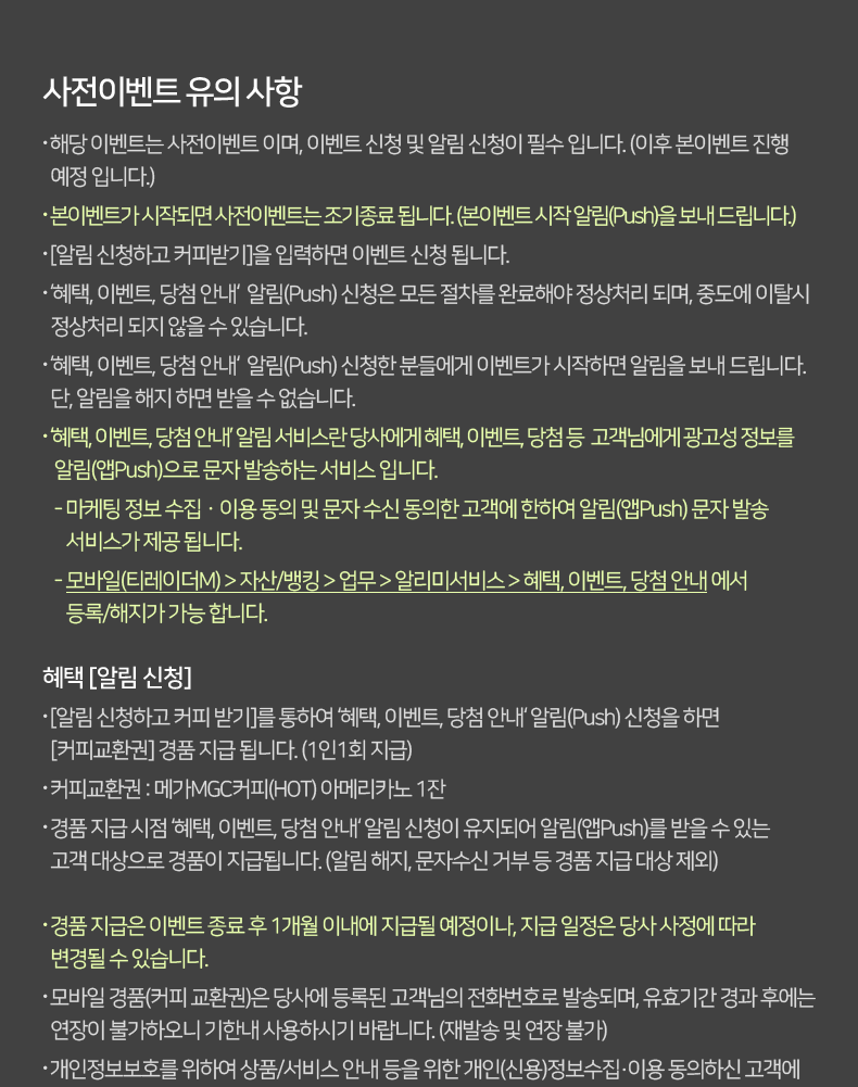 - [알림 신청하고 커피 받기]를 통하여 ‘혜택, 이벤트, 당첨 안내‘ 알림(Push) 신청을 하면 [커피교환권] 경품 지급 됩니다. (1인1회 지급)