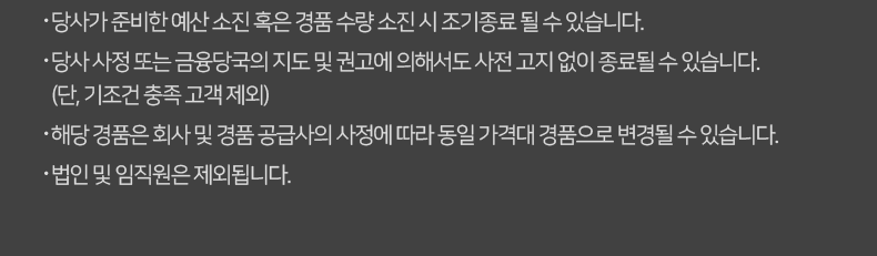 - 당사 사정 또는 금융당국의 지도 및 권고에 의해서도 사전 고지 없이 종료될 수 있습니다. (단, 기조건 충족 고객 제외)