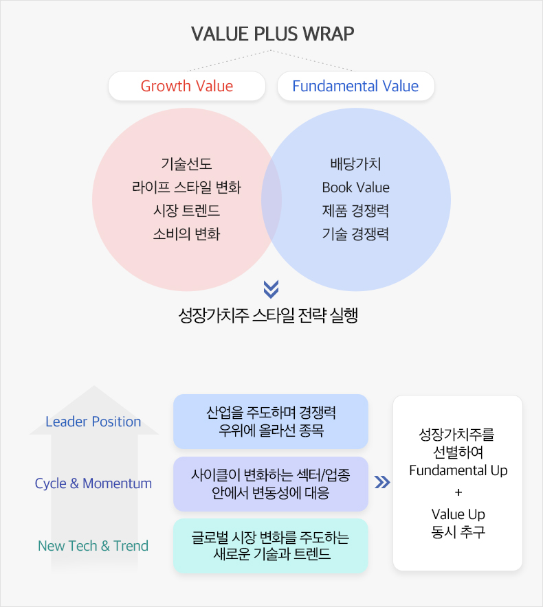 Growth value와 Fundamental value를 기반으로 성장가치주 투자 전략을 실행하며, 산업사이클&모멘텀투자를 병행함으로써 증시 변화에 능동적으로 대처하는 상품