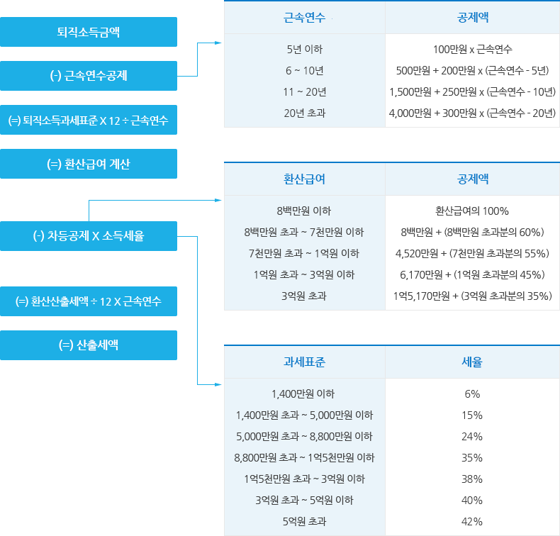 - (=)퇴직소득과세표준 × 12 ÷ 근속연수