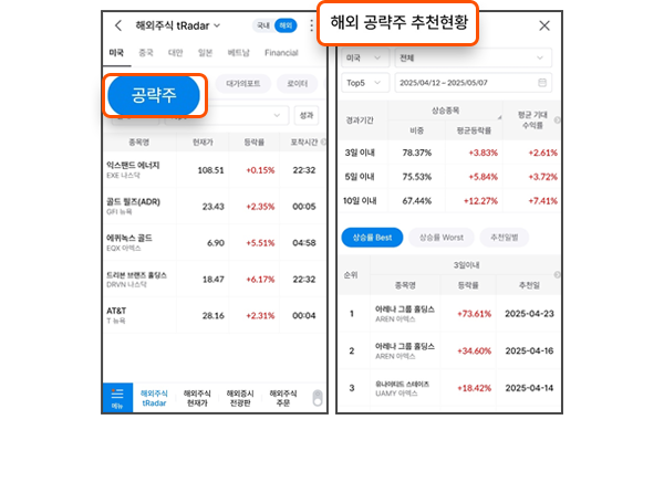 - 관심있는 국가의 시총상위/거래상위 추이 확인 → 등락률 높은 종목의 업종별 추이 확인 → 해당 업종의 개별 종목 티레이더 신호 확인