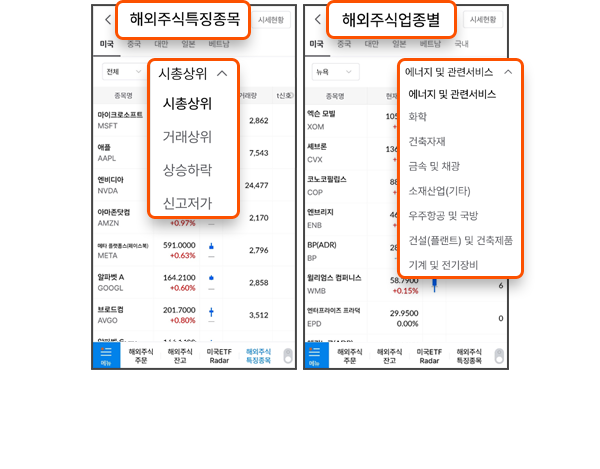 티레이더M → 해외주식 시세 → 해외주식업종별